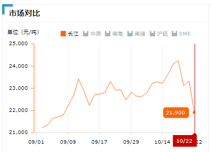2021年10月22日長江有色A00鋁價21900下跌1430,最低21880最高21920,前三日均價23556.67,前五日均價23680。