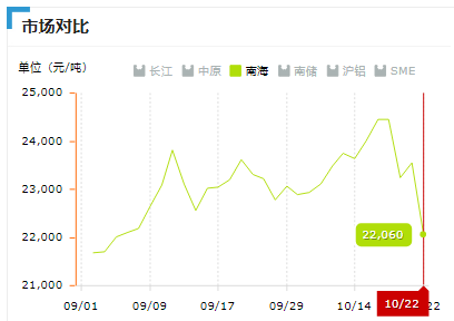 2021年10月22日南海有色佛山A00鋁價22060下跌1480,最低22010最高22110,前三日均價23740,前五日均價23936。