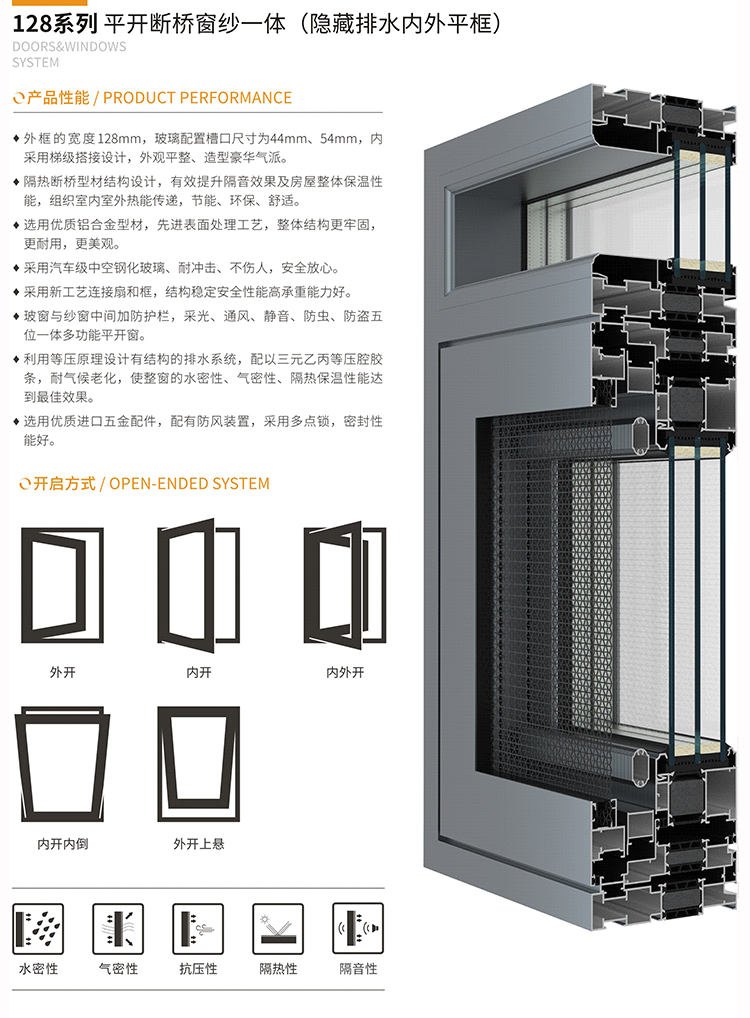 利用等壓原理設(shè)計(jì)有結(jié)構(gòu)的排水系統(tǒng),配以三元乙丙等壓腔膠條,耐氣候老化,使整窗的水密性、氣密性、隔熱保溫性能達(dá) 到最佳效果。